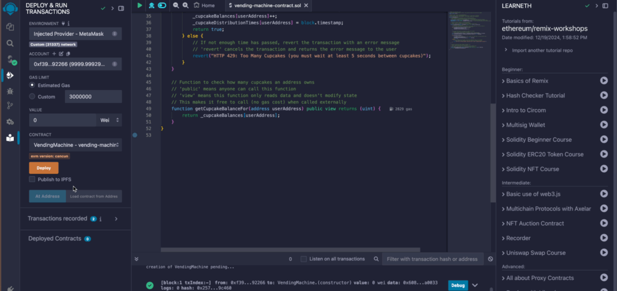 VendingMachinecontract to theLocalhostnetwork, then go to the "Deploy & Run Transactions" tab and click "Deploy."